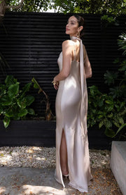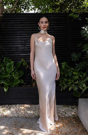 Nothing is more decadent than champagne bridesmaid dresses and no more so than our Pollenca dress —a floor-length, cowl neck bias-cut evening dress with adjustable straps and a detachable sash. Wear the tie at the waist or neck for a clean modern look. Perfect for any occasion whether you are after a wedding guest gown, prom dress, or luxe evening dress.