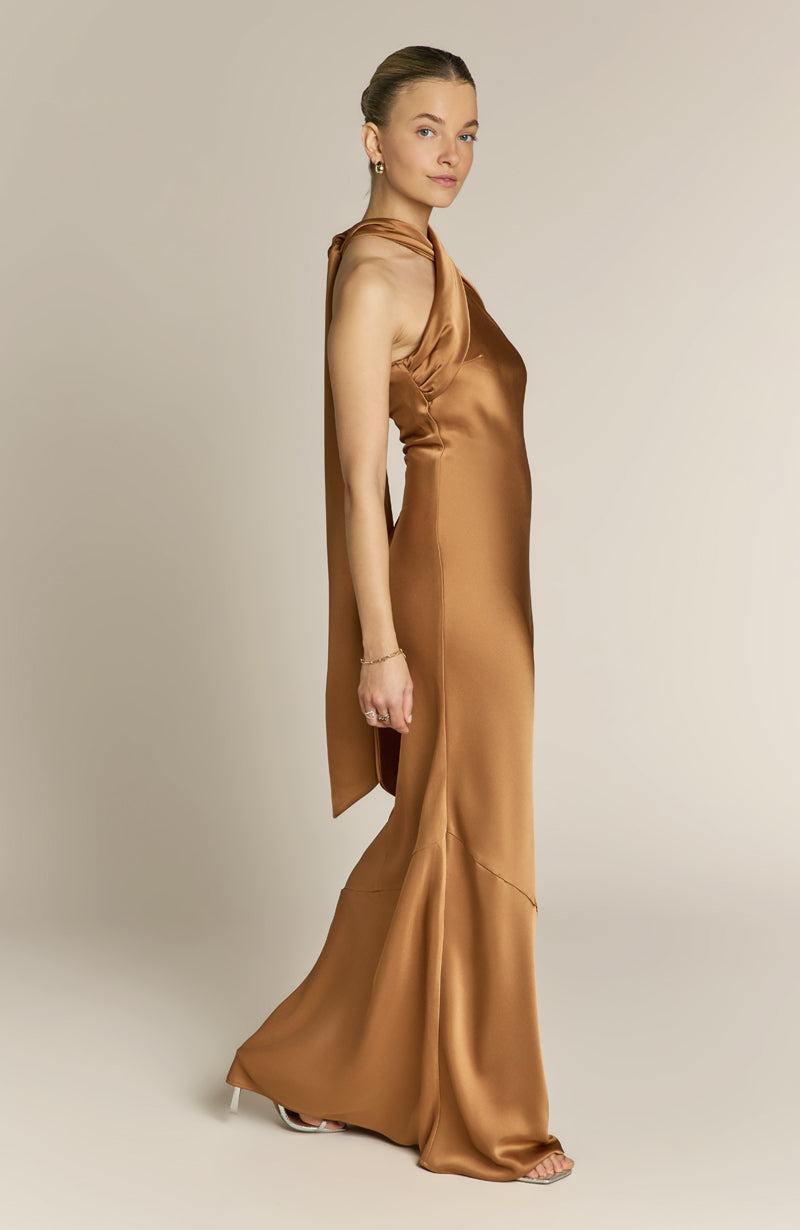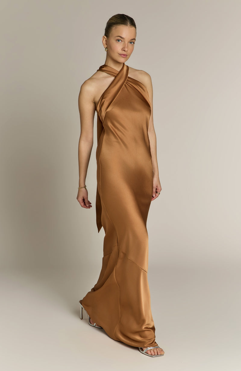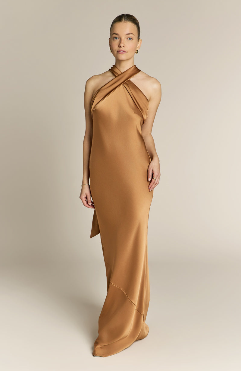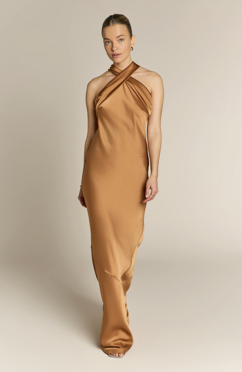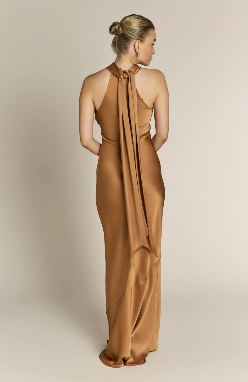 Caramel hits the collection. The Roma dress is our best-selling halterneck style with a long neck sash tie and bias-cut skirt that moves beautifully. Cut from luxe satin, this caramel dress feels fluid yet structured. A modern satin bridesmaid dress that works for weddings, parties, or city events.
