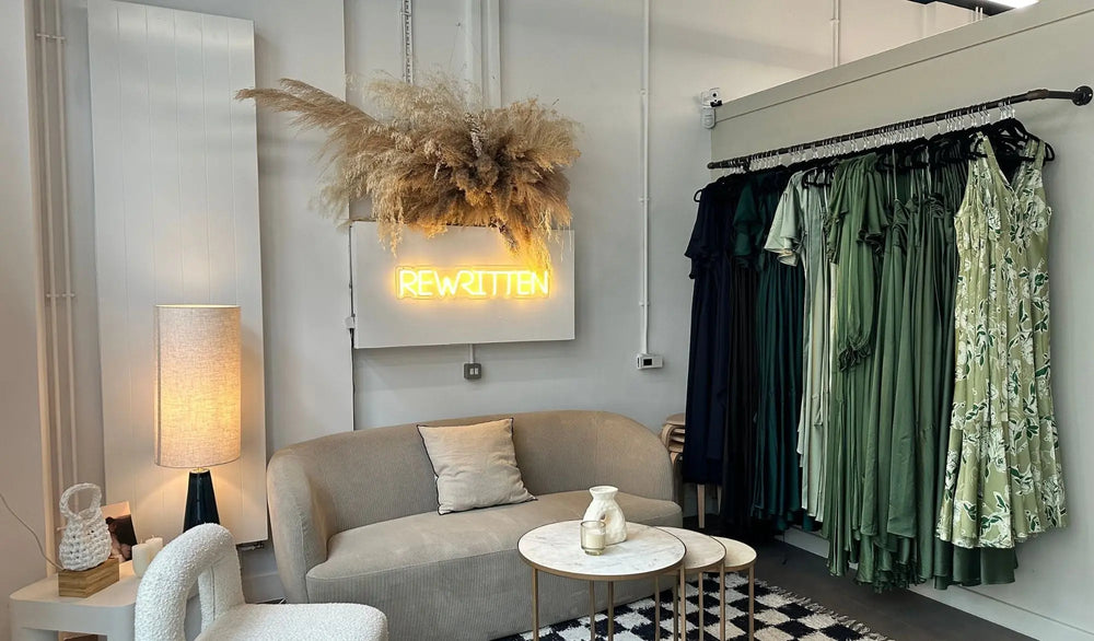 Located in the vibrant heart of Hackney Wick, Rewritten’s flagship showroom is the ultimate destination for bridesmaids dress shopping in London. Designed with the modern bridal party in mind, our comfortable showroom offers a stress-free alternative to ordering multiple dresses online and dealing with the hassle of returns. Instead, bring your bridesmaids to enjoy a full trying-on session, surrounded by our full collection of bridesmaids and bridal dresses.
