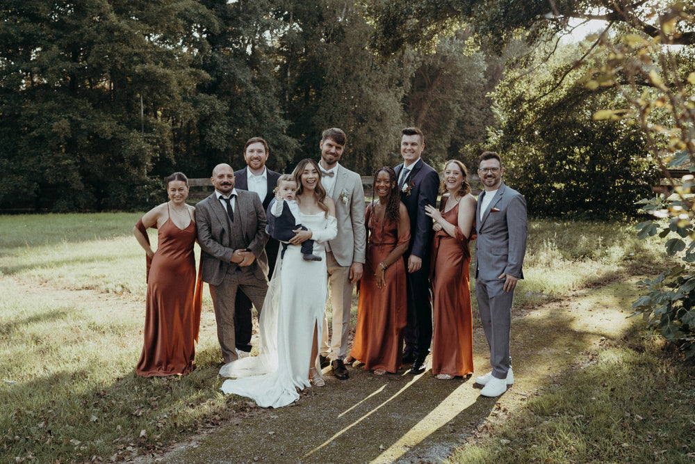 And oh, those bridesmaids! They wore the Brooklyn dress in Terracotta, a rich, earthy tone that popped beautifully against the natural greens of the surroundings. The Brooklyn is a simple slip dress yet so elegant, with a detachable sash the bridesmaids all used as an accessory. The groomsmen didn’t miss a beat either, their pocket squares tying it all together for a perfectly coordinated look.