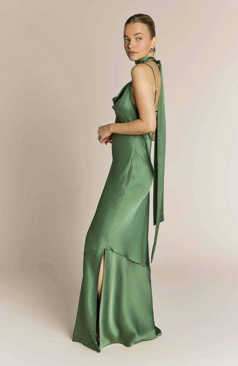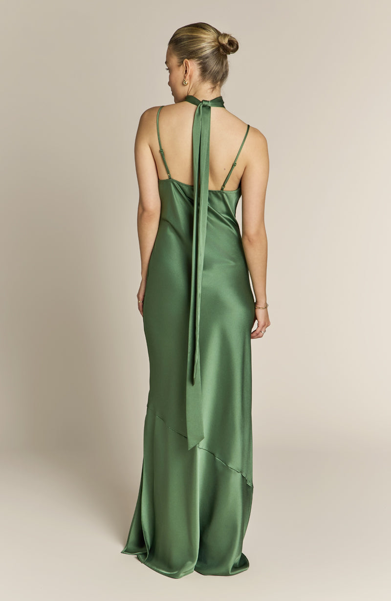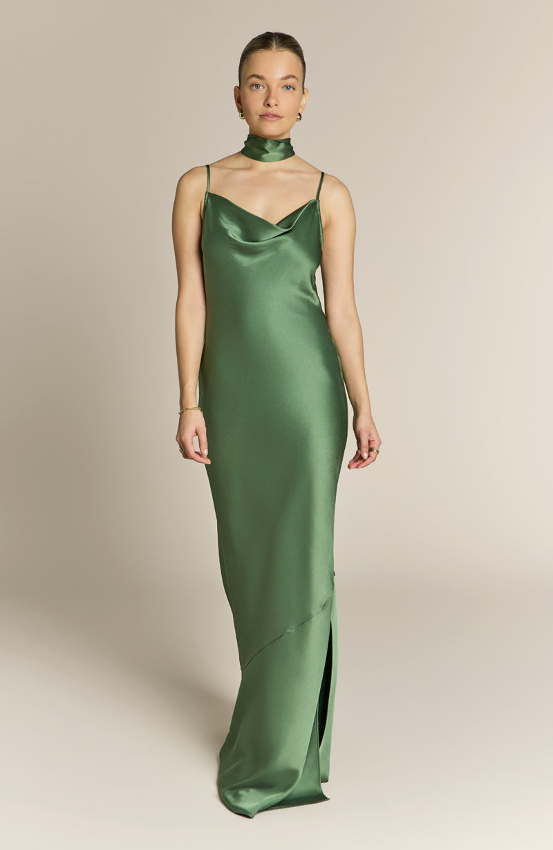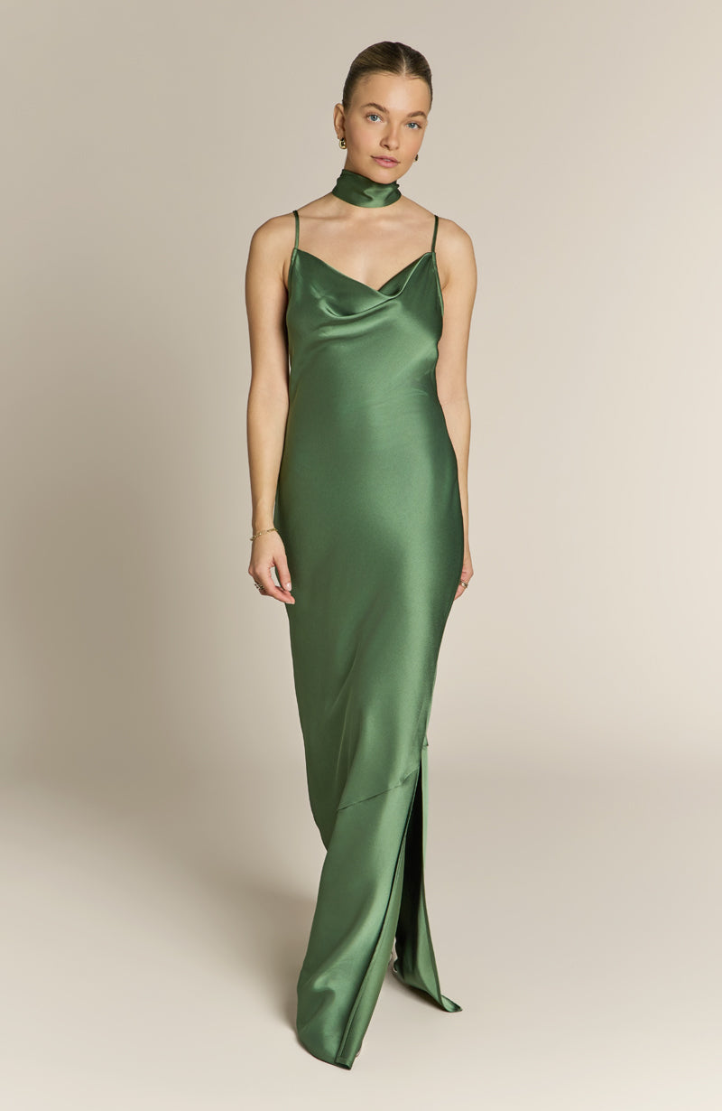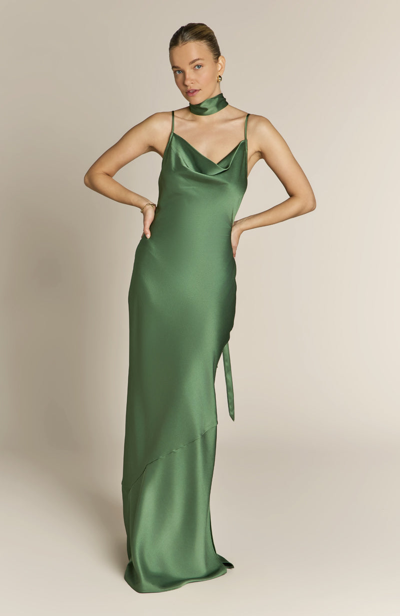 Meet Pollenca in olive green. Cowl-neck, bias-cut, and fuss-free, this dress has a detachable sash you can style around the neck or waist for different looks. No zips, no fastenings, just fluid satin that drapes beautifully. The ultimate modern satin bridesmaid or wedding guest dress with flexible styling.