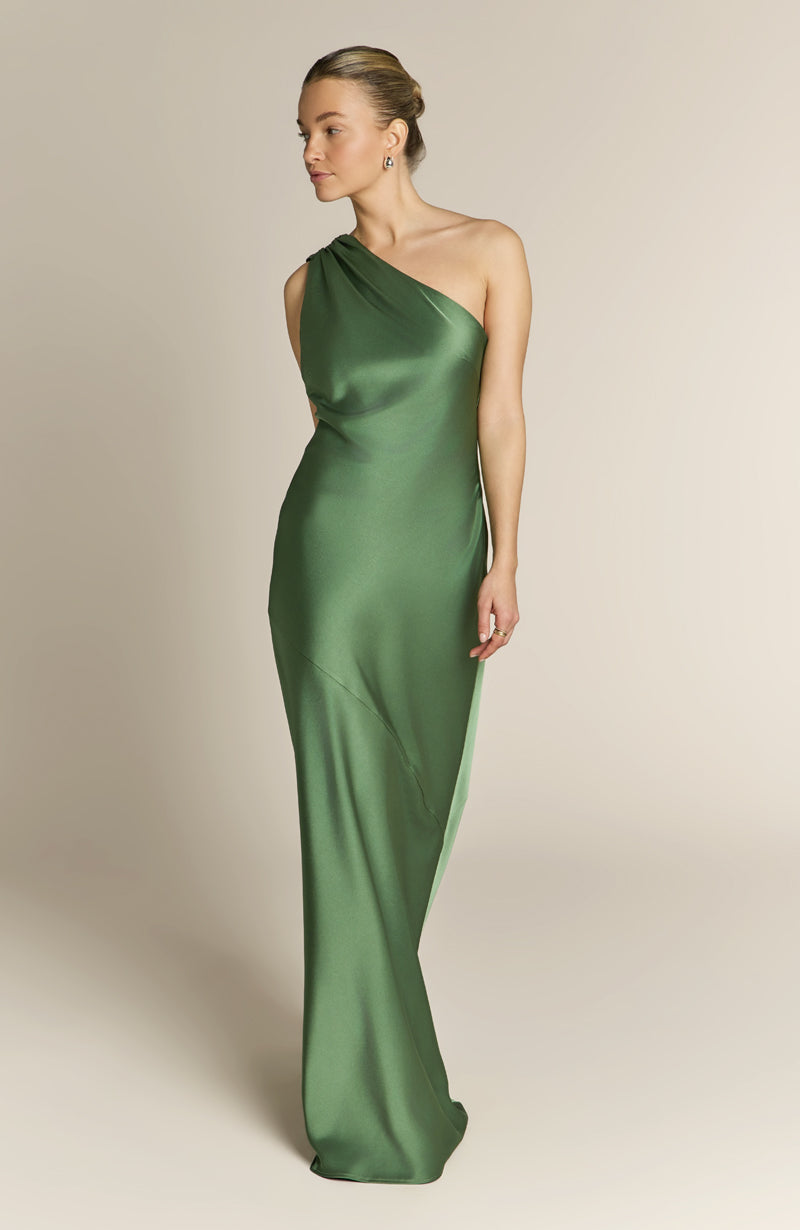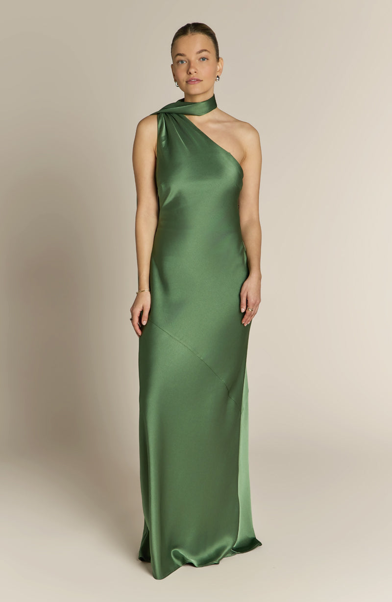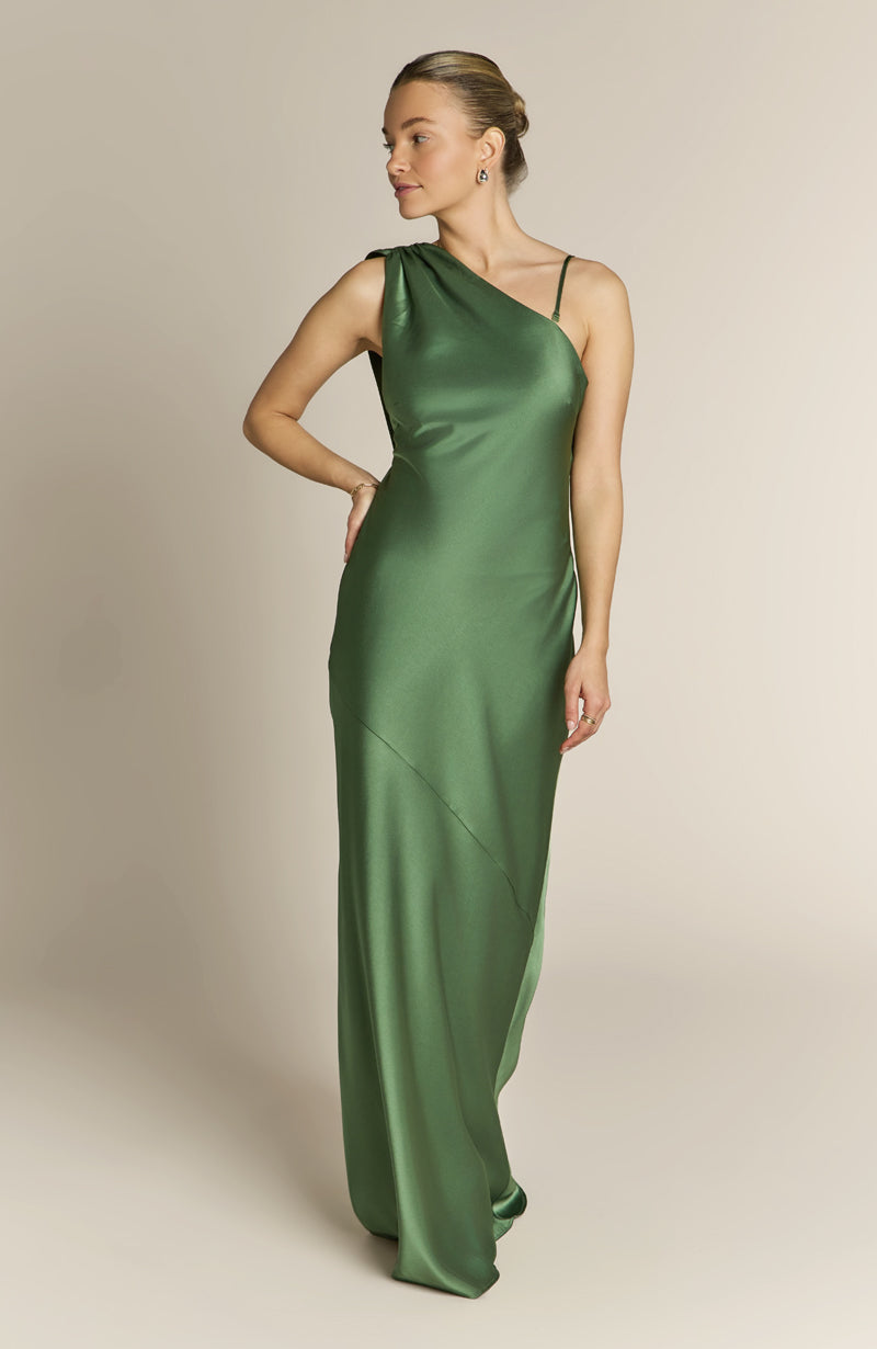 This is the Raye one shoulder bridesmaid dress in olive green - sleek, wearable, and quietly confident. Featuring a fully detachable strap and a long hanging neck sash for multiple styling options and crafted in high-quality luxe satin that moves without drama. The olive green satin bridesmaid dress made for tonal bridal parties and modern wedding styling.