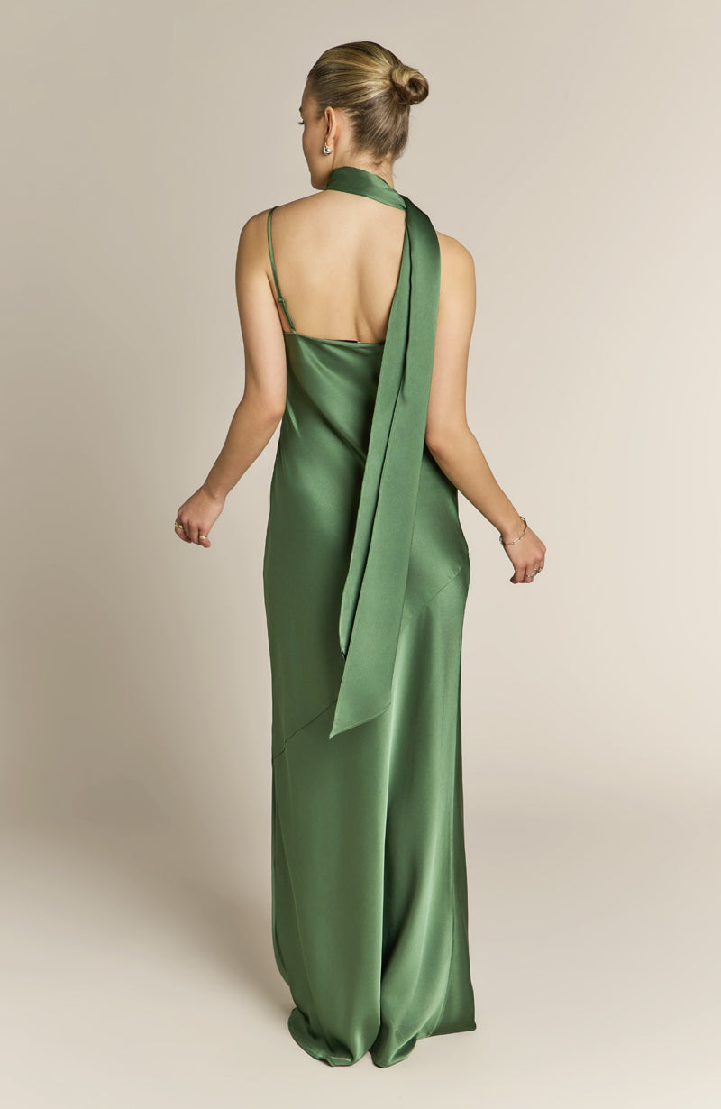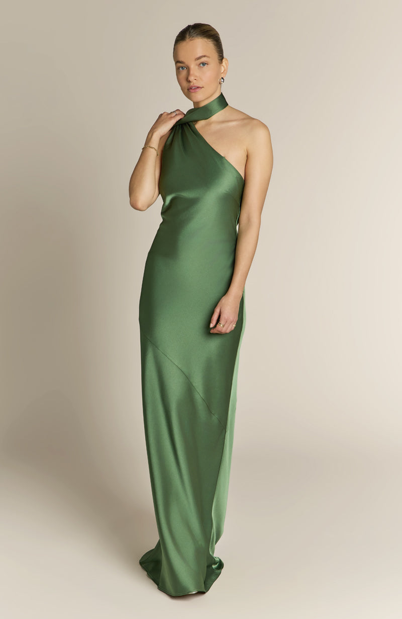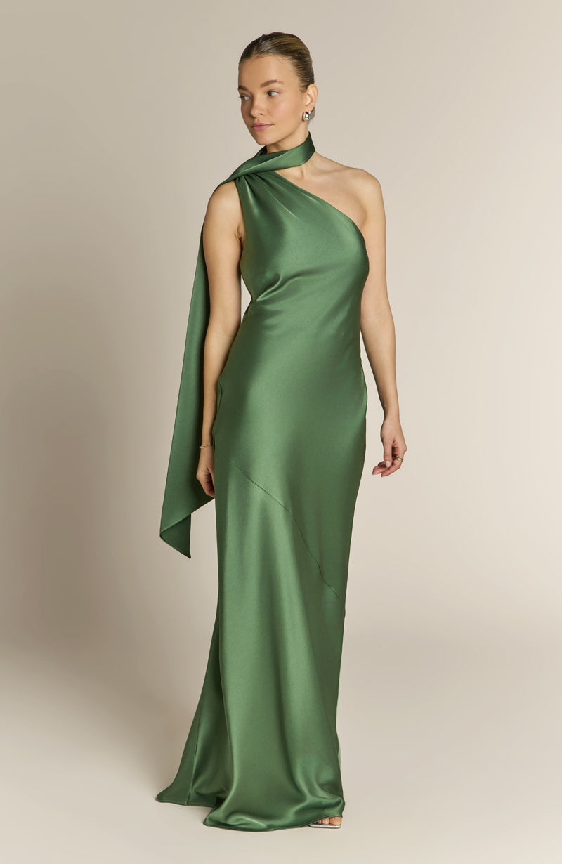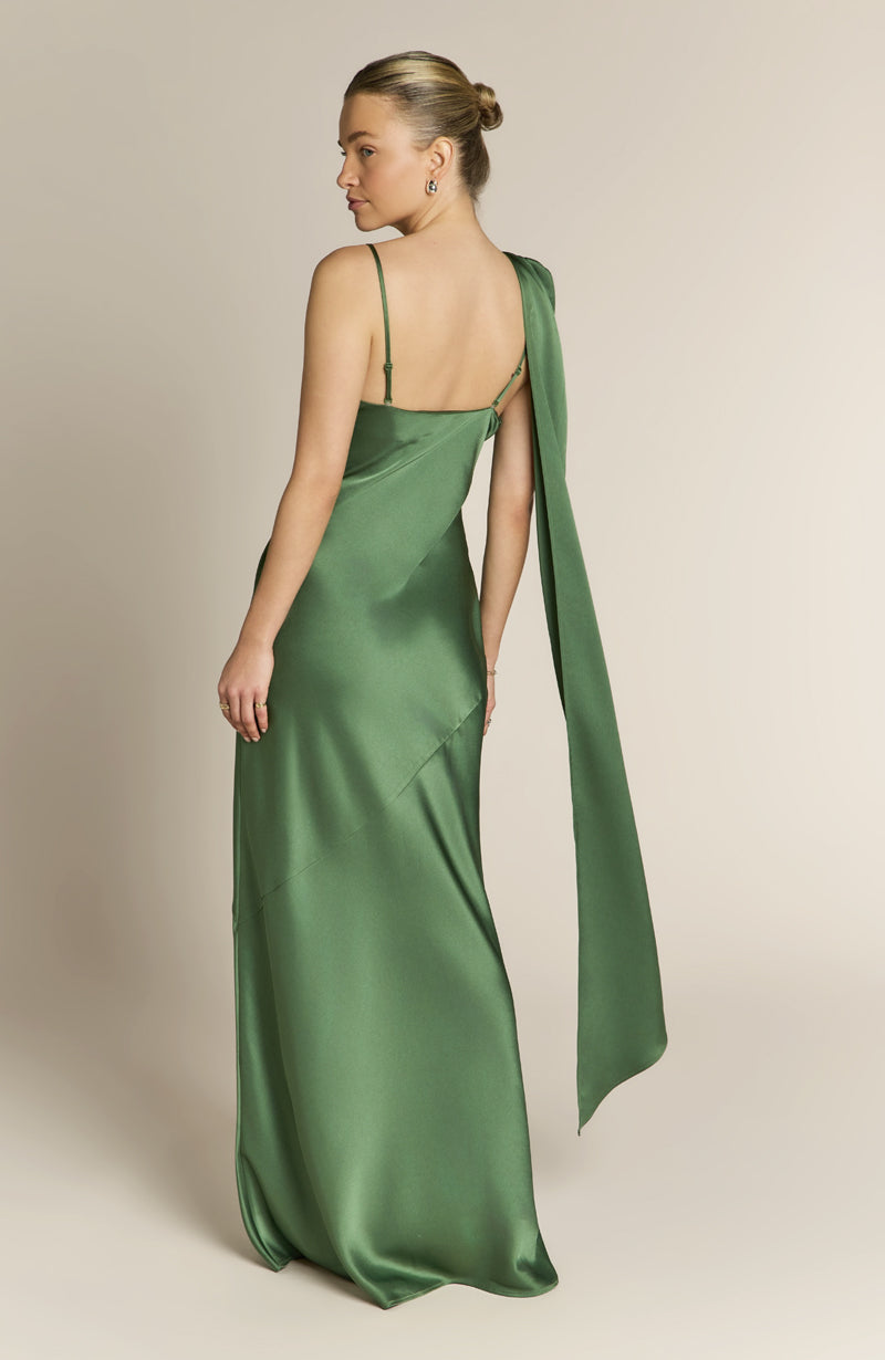 This is the Raye one shoulder bridesmaid dress in olive green - sleek, wearable, and quietly confident. Featuring a fully detachable strap and a long hanging neck sash for multiple styling options and crafted in high-quality luxe satin that moves without drama. The olive green satin bridesmaid dress made for tonal bridal parties and modern wedding styling.