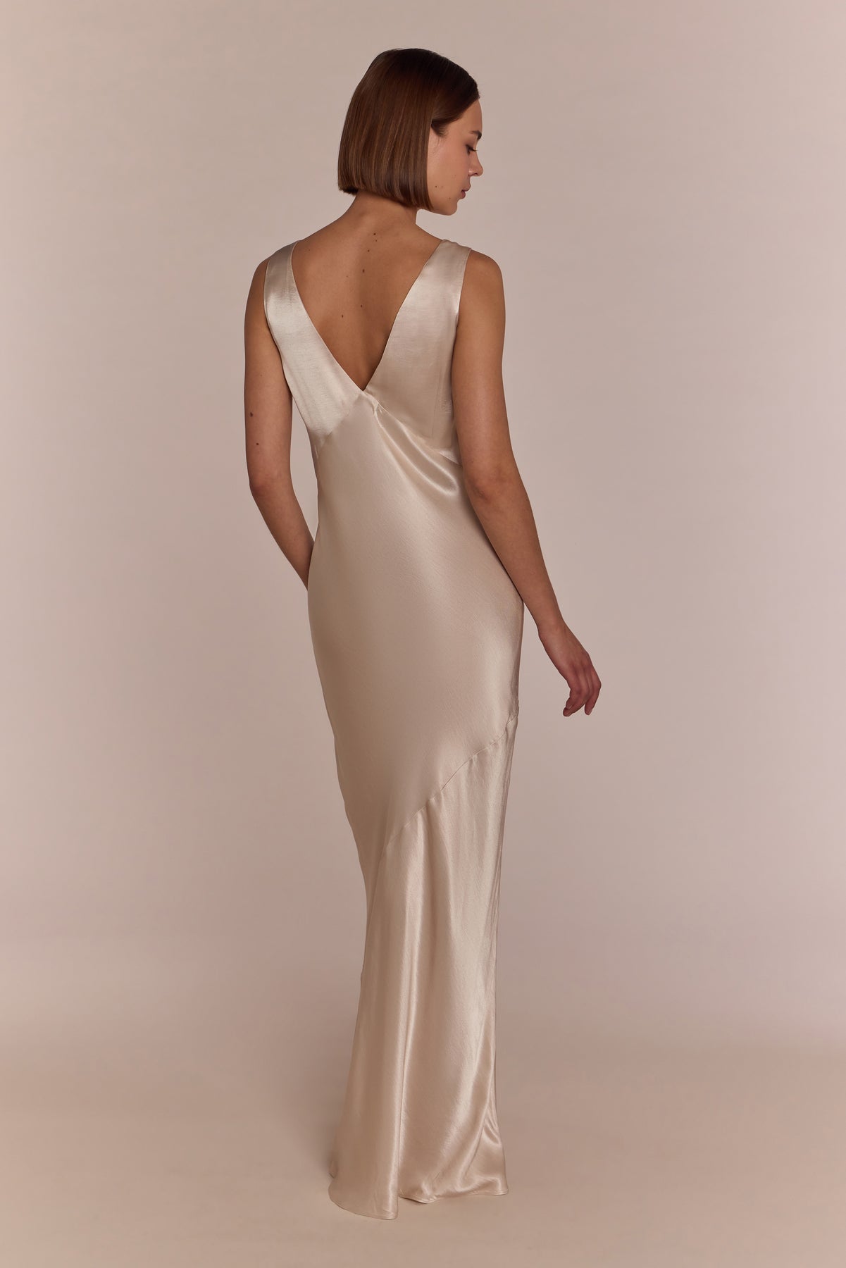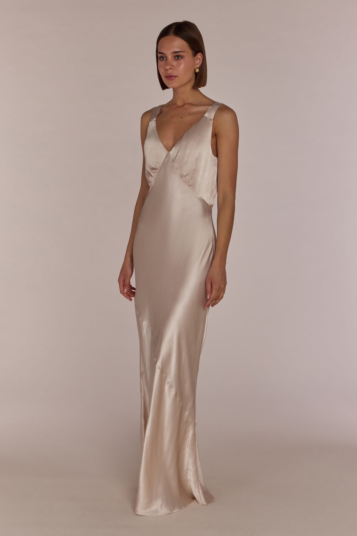 Cut on the bias for a fluid, flattering fit, this full-length champagne satin dress features a clean V-neckline, supportive thick straps and a seamless slip silhouette that skims the body without clinging. Perfect for bridesmaids, wedding guests, proms and evening events.