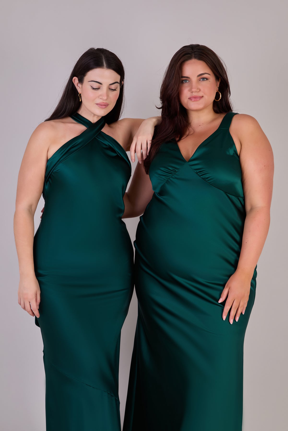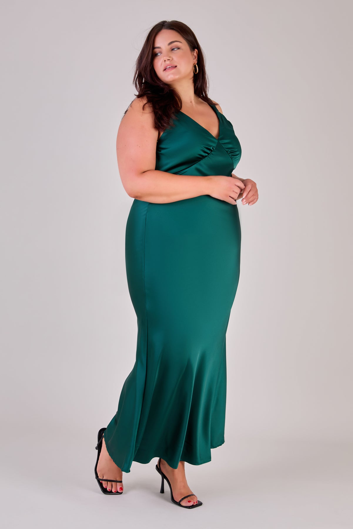 Curvy model in forest green satin bridesmaid dress