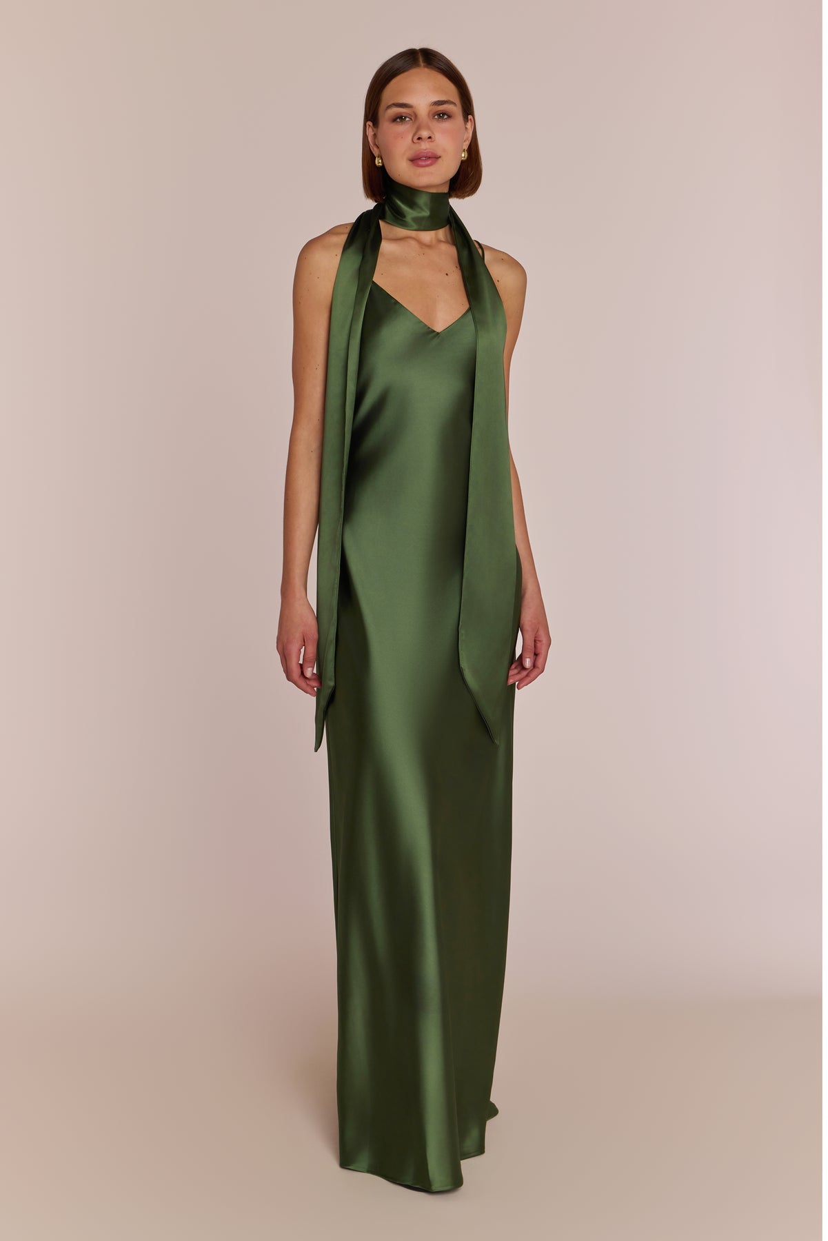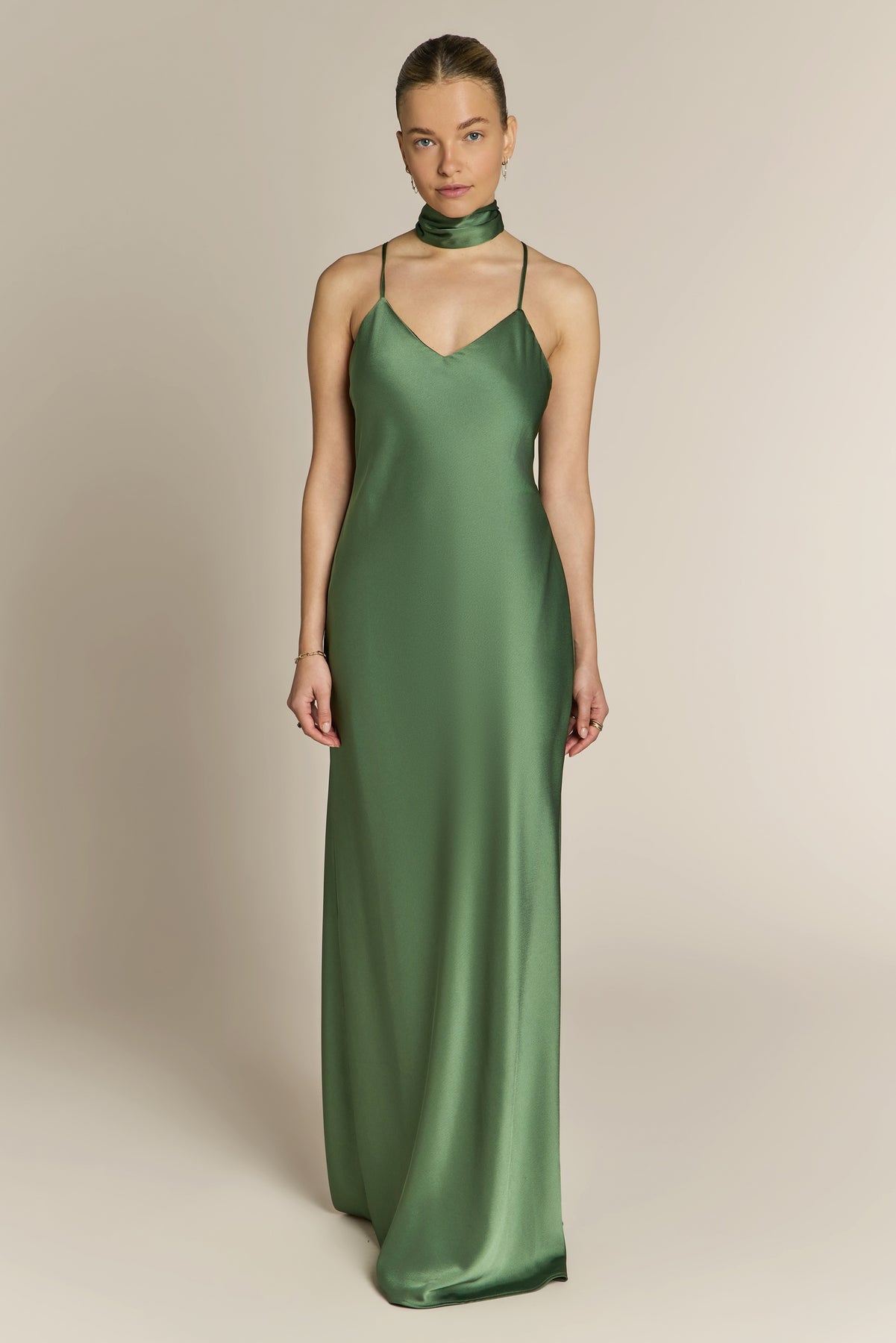 Cut on the bias for a smooth, body-skimming fit, this full-length olive green satin slip dress features a detachable sash you can tie, drape or remove for a personalised look. Designed to mix and match effortlessly with sage green bridesmaid dresses.