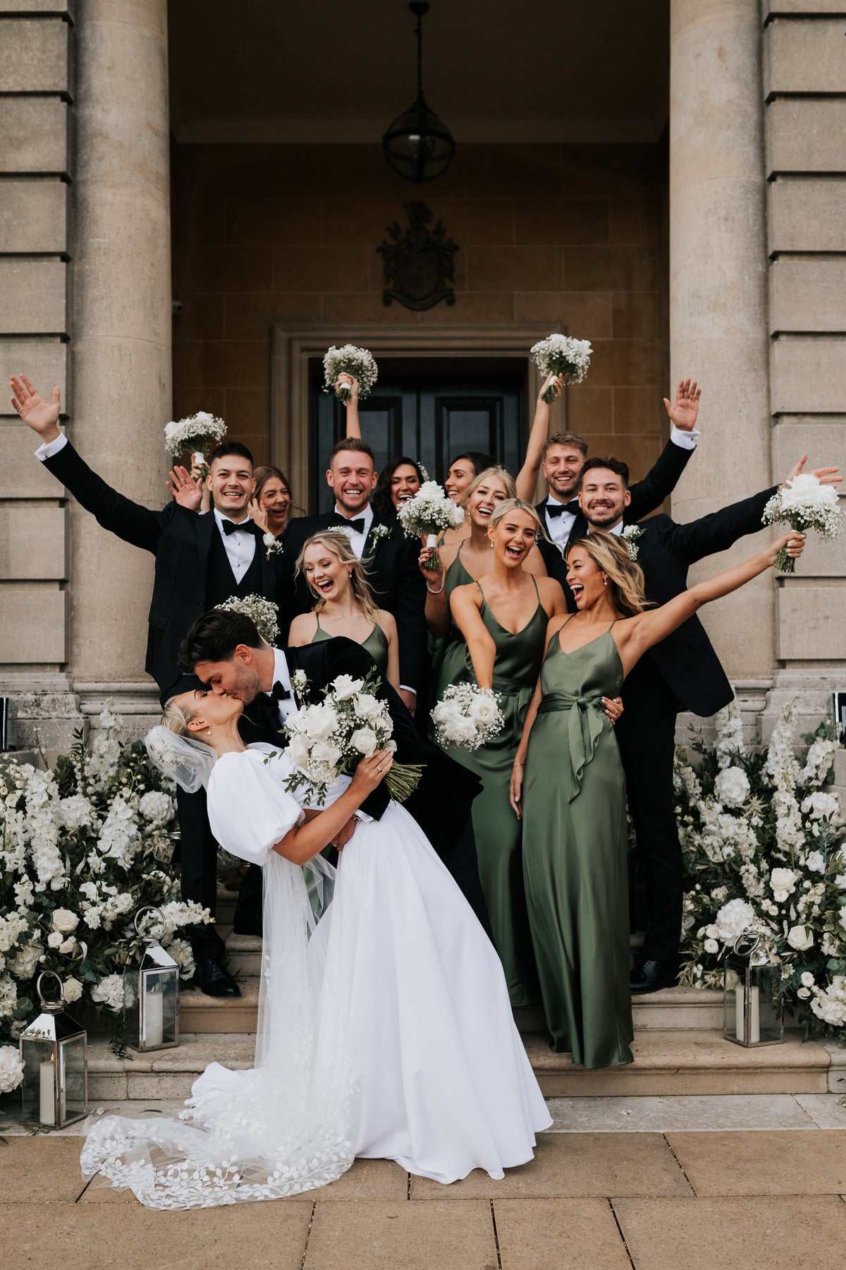 Bride in a white dress with three bridesmaids in green dresses, all holding bouquets outdoors.