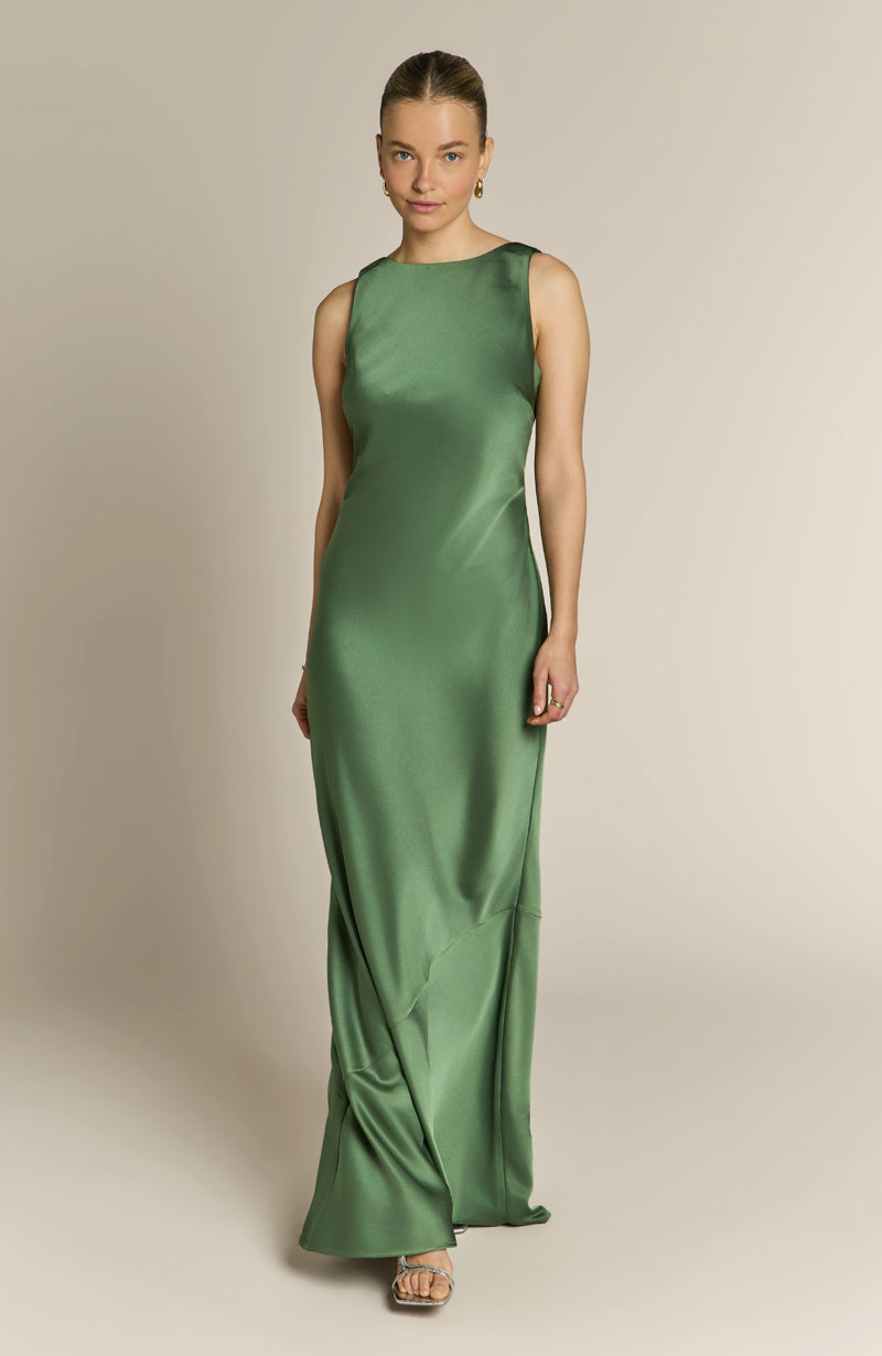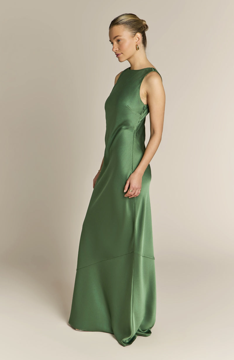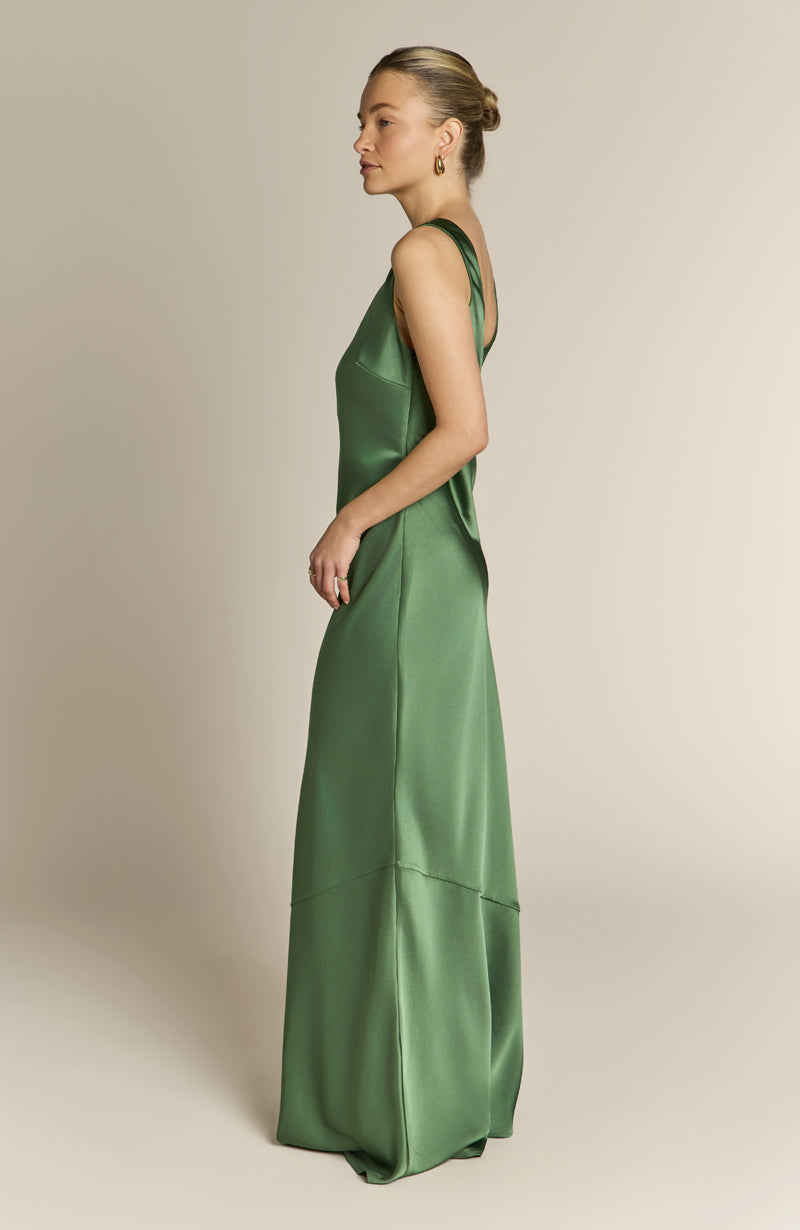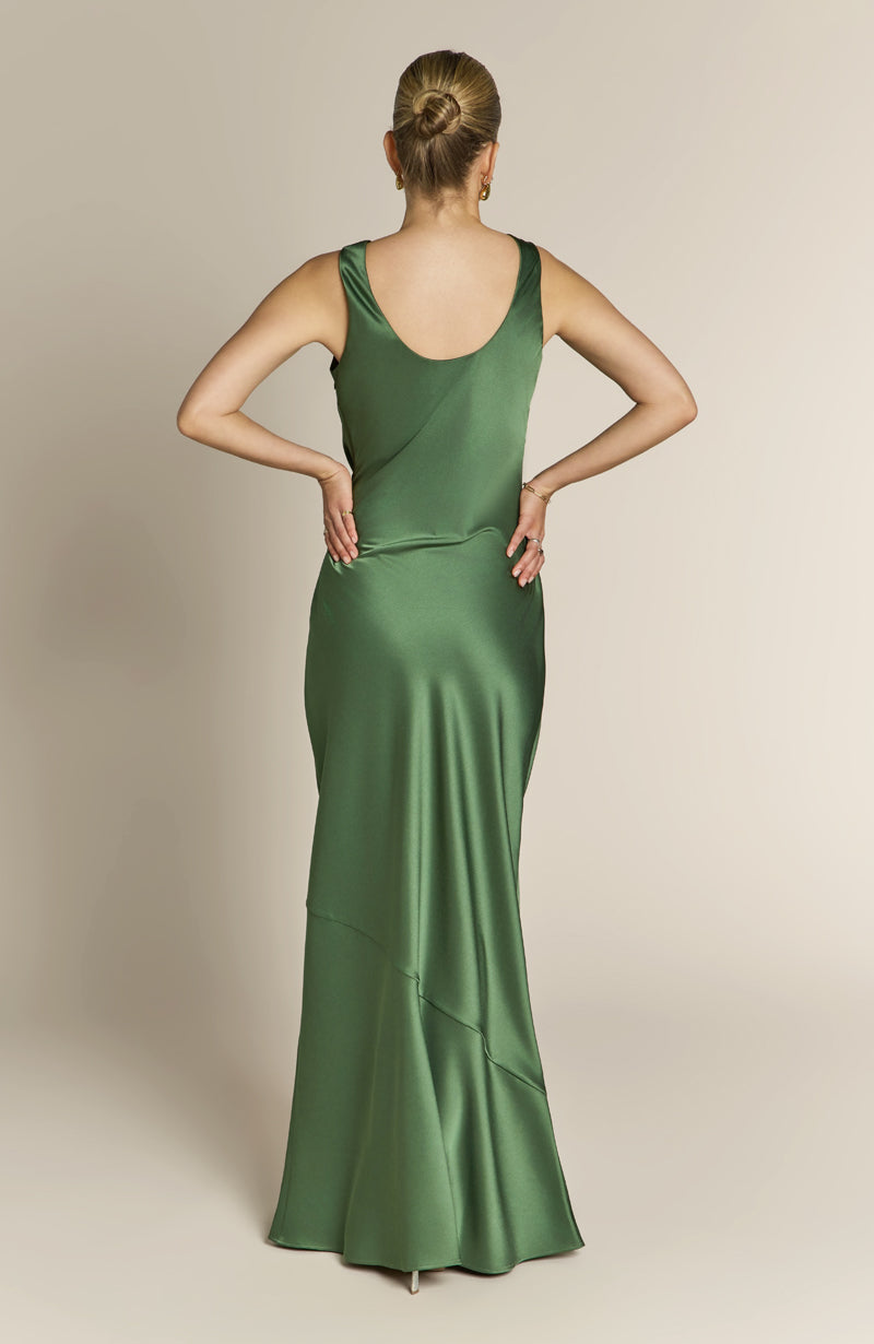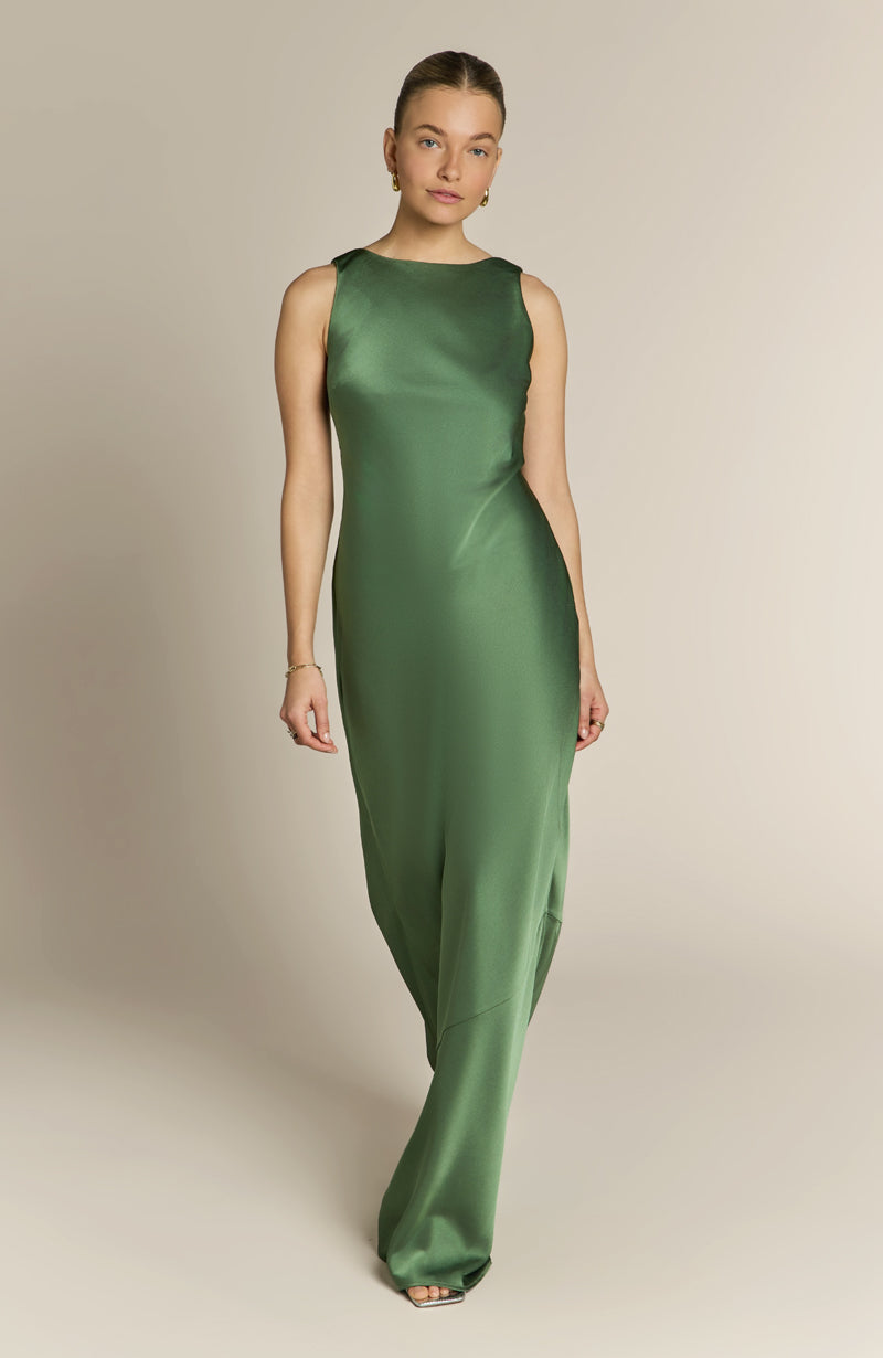 Olive green and elevated - the brand new Paloma dress is high-neck, full-length, and features a dramatic scoop back, cut from premium satin. Minimal and versatile, it flows beautifully while holding its shape. Perfect for modern bridesmaids, tonal wedding palettes, or city-chic celebrations. Can be worn with any bra for easy wearing. You are welcome.