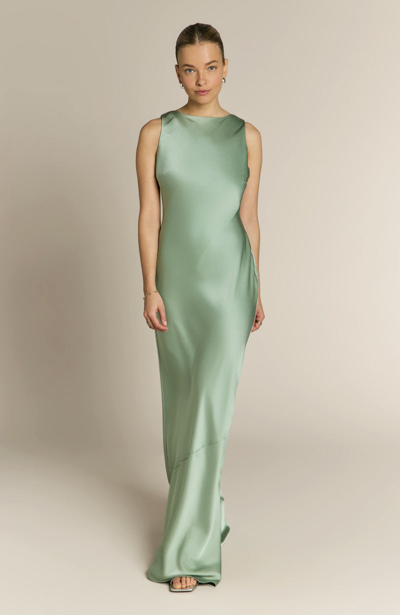 The Paloma dress in sage green is a modern take on a classic silhouette. High-neck and full-length with a scoop back, it’s cut from premium satin that drapes beautifully and is crazy flattering. Sleek, fluid, and fuss-free, it moves with you while keeping clean lines. Ideal for modern bridesmaids or wedding guests who want effortless polish.