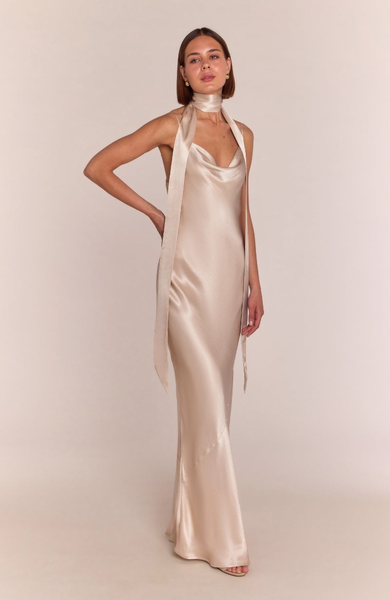 Nothing is more decadent than champagne bridesmaid dresses and no more so than our Pollenca dress —a floor-length, cowl neck bias-cut evening dress with adjustable straps and a detachable sash. Wear the tie at the waist or neck for a clean modern look. Perfect for any occasion whether you are after a wedding guest gown, prom dress, or luxe evening dress.