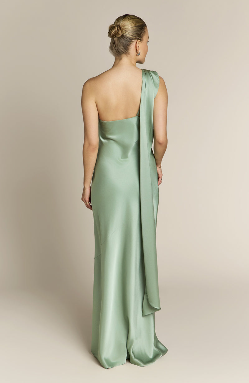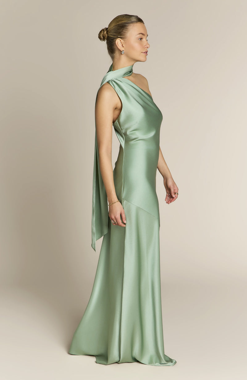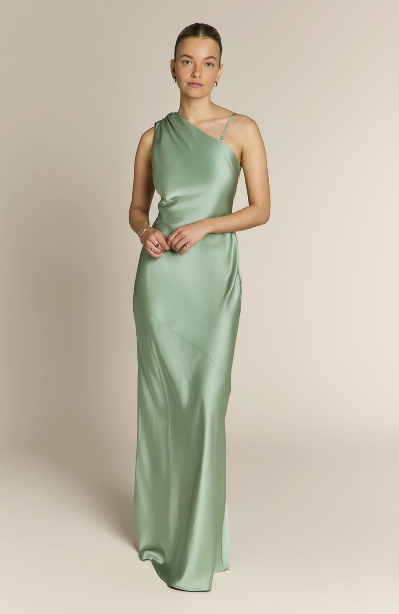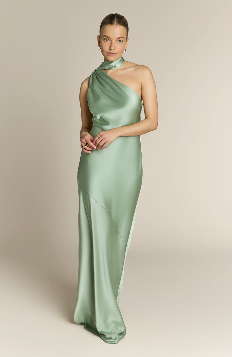 The Raye one shoulder bridesmaid dress in sage green keeps it cool and uncomplicated. Designed with a detachable strap and a long styling sash that works around the neck or worn loose and made from premium satin for a clean drape that doesn’t crease under pressure. A modern sage green satin bridesmaid dress that fits right into outdoor and contemporary weddings.