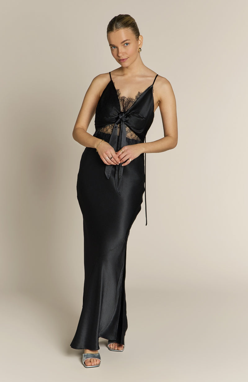 The statement piece your party wardrobe has been waiting for. Crafted in fluid black satin with delicate lace panelling and a detachable tie, this dress captures the essence of modern romance and effortless cool that defines Rewritten. With its flattering bias cut, barely-there straps and a touch of 90s nostalgia, Remi is designed to move with you from candlelit dinners to dancefloors that last until dawn.