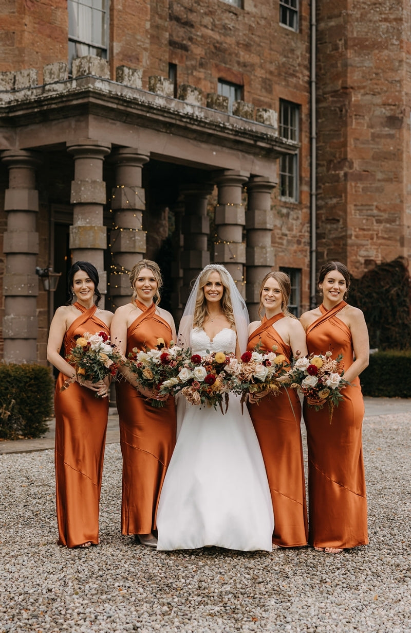 Looking for burnt orange bridesmaid dresses? Look no further than the bias cut, halter neck Roma dress. This flowing satin dress could be worn again and again - whether as a cocktail dress, evening dress or even a dress to wear to the races. The long bow tie draping down the back adds some drama to a subtly sexy and timeless occasion dress.