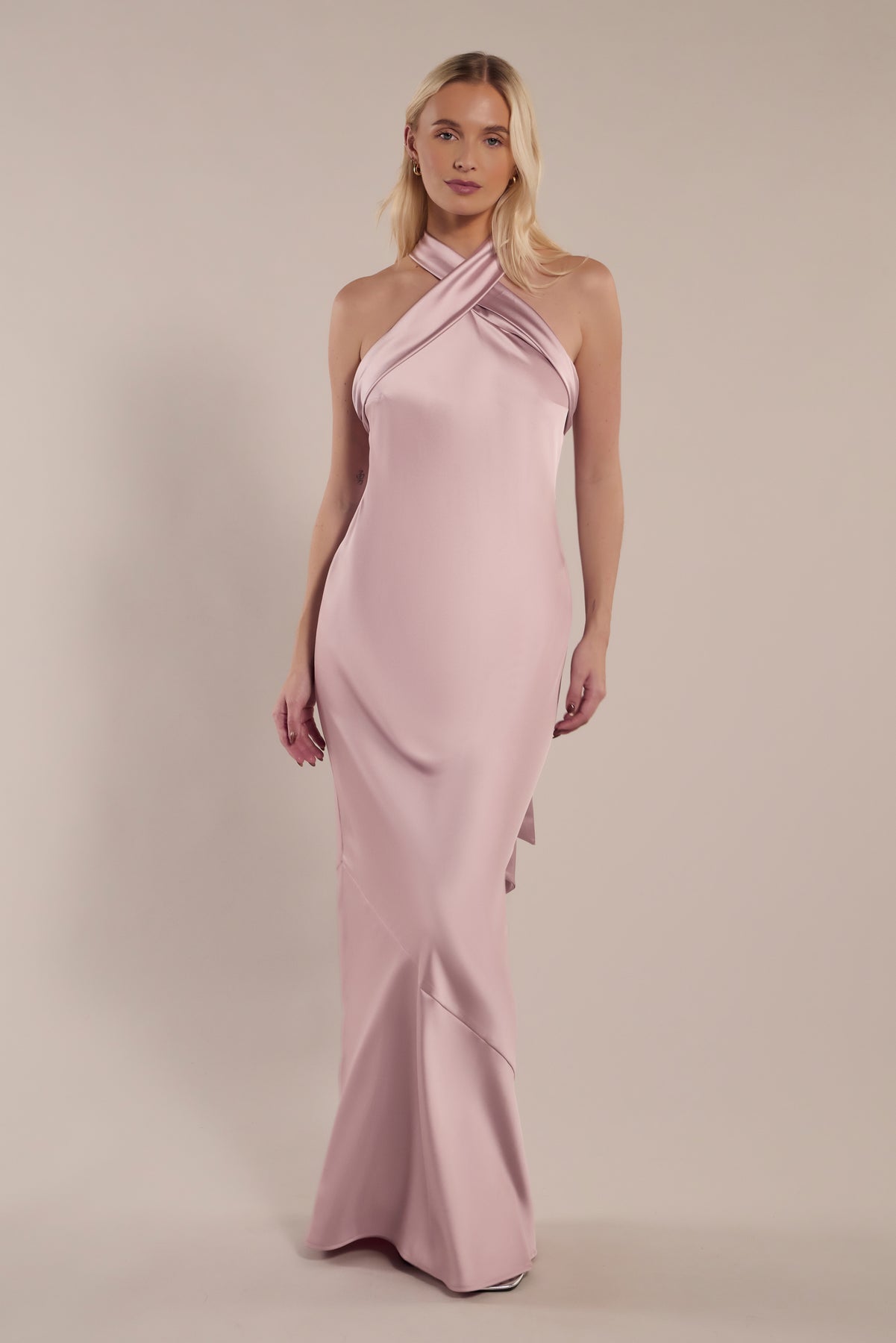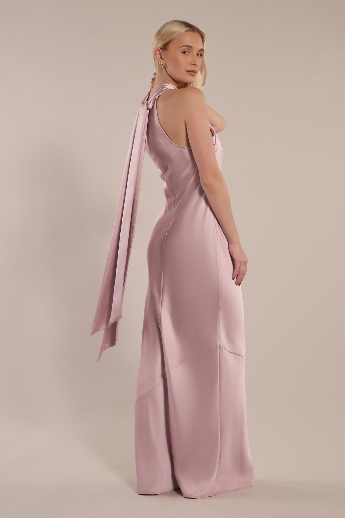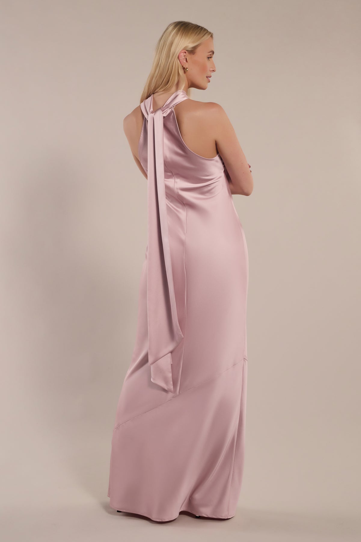 If it is pink bridesmaid dresses you are after then look no further than the Roma halter evening dress. Call it a blush pink bridesmaid gown or dusty pink bridesmaids dress, our rose shade of pink is sure to flatter all skin tones and works year round, whatever the occasion. This bias cut dress features a high neck and sweeping back neck tie for extra drama. The Roma won't look out of place as a wedding guest gown, prom dress or long evening dress. Wait for the compliments to flood in.